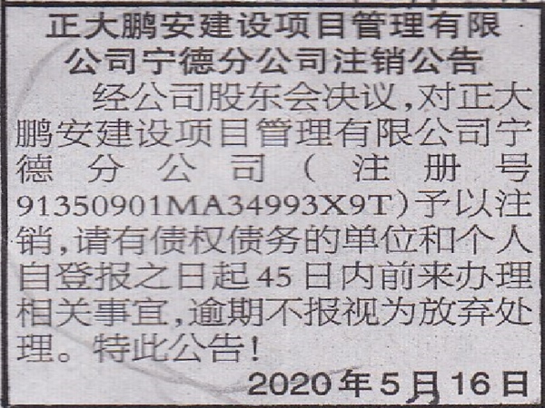 經(jīng)公司股東會決議,對正大鵬安建設(shè)項(xiàng)目管理有限公司寧德分公司(注冊號91350901MA34993X9T)予以注銷,請有債權(quán)債務(wù)的單位和個人自登報之日起45日內(nèi)前來辦理相關(guān)事宜,逾期不報視為放棄處理,特此公告。