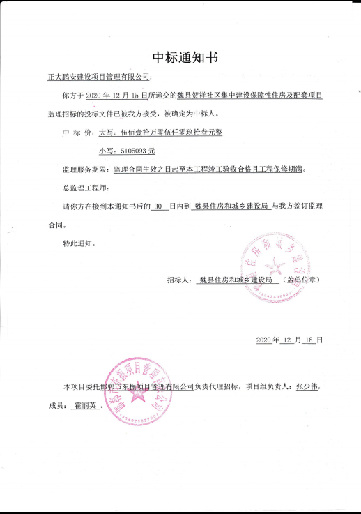 2020年12月18日,經評標委員會綜合評審,招標人確認,正大鵬安建設項目管理有限公司中標魏縣賀祥社區(qū)集中建設保障性住房及配套項目監(jiān)理。
