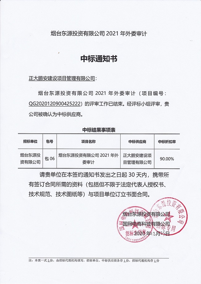 近日,我公司參與了“煙臺東源投資有限公司2021年外委審計(jì)(項(xiàng)目編號:QG2020120900425222)的招標(biāo)項(xiàng)目”經(jīng)評標(biāo)小組評審,招標(biāo)人確認(rèn),正大鵬安公司被確認(rèn)為中標(biāo)供應(yīng)商。