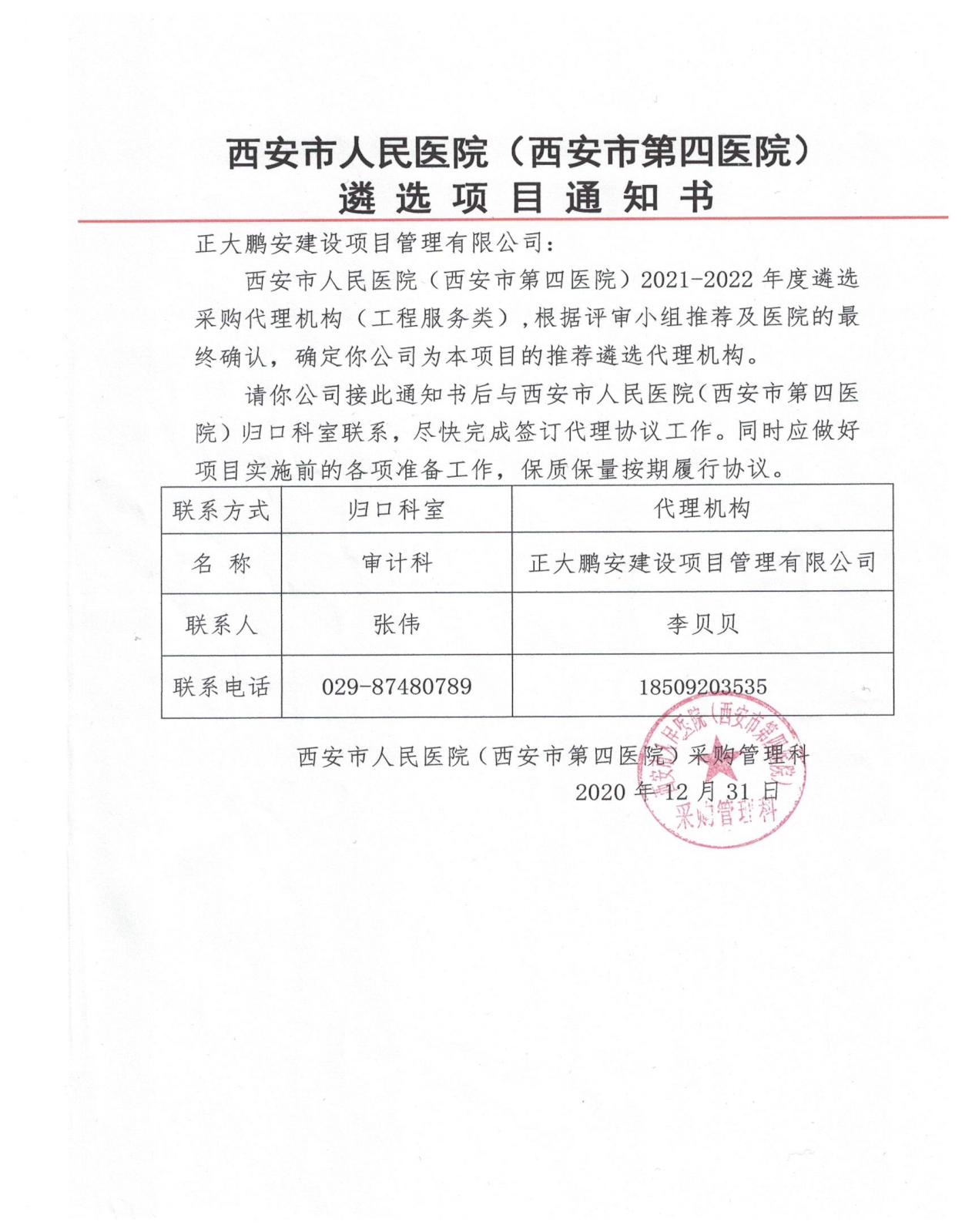 正大鵬安入圍西安市人民醫(yī)院(西安市第四醫(yī)院)2021-2022年度遴選采購(gòu)代理機(jī)構(gòu)(工程服務(wù)類)