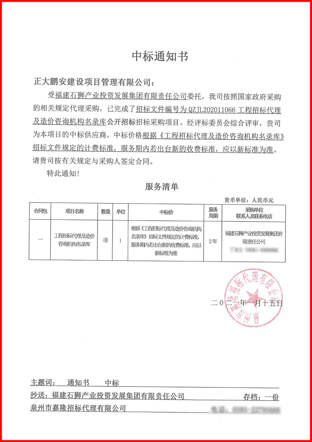 近日,福建石獅產(chǎn)業(yè)投資發(fā)展集團(tuán)有限責(zé)任公司委托第三方就“招標(biāo)文件編號為QZJL202011066 工程招標(biāo)代理及造價咨詢機(jī)構(gòu)名錄庫”項(xiàng)目進(jìn)行公開招標(biāo),經(jīng)評審委員會綜合評審,招標(biāo)人確認(rèn),正大鵬安建設(shè)項(xiàng)目管理有限公司為該項(xiàng)目的中標(biāo)供應(yīng)商,服務(wù)周期為兩年。