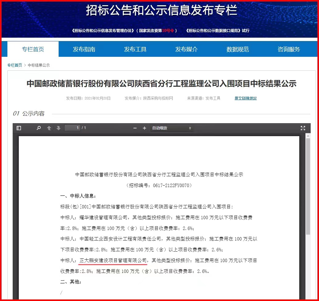 2021年2月,經(jīng)評(píng)標(biāo)委員會(huì)評(píng)定,招標(biāo)人確認(rèn),正大鵬安建設(shè)項(xiàng)目管理有限公司入圍中國(guó)郵政儲(chǔ)蓄銀行股份有限公司的“中國(guó)郵政儲(chǔ)蓄銀行股份有限公司陜西省分行工程監(jiān)理”項(xiàng)目。