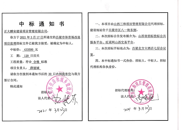 近日,呂梁市住房和城鄉(xiāng)建設(shè)局對“呂梁市體育場改造監(jiān)理項目”進(jìn)行公開招標(biāo),經(jīng)評標(biāo)委員會綜合評審,招標(biāo)人確認(rèn),正大鵬安建設(shè)項目管理有限公司中標(biāo)。