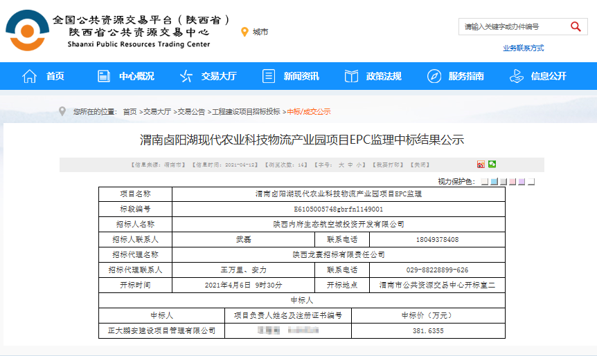 2021年4月6日,正大鵬安建設(shè)項目管理有限公司參與了“渭南鹵陽湖現(xiàn)代農(nóng)業(yè)科技物流產(chǎn)業(yè)園項目EPC監(jiān)理”投標,經(jīng)評標小組評審,招標人陜西內(nèi)府生態(tài)航空城投資開發(fā)有限公司確認,正大鵬安建設(shè)項目管理有限公司中標。