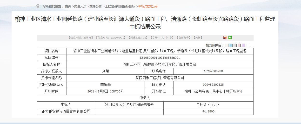 正大鵬安中標(biāo)榆神工業(yè)區(qū)清水工業(yè)園延長(zhǎng)路(建業(yè)路至長(zhǎng)匯源大道段)路面工程、浩通路(長(zhǎng)虹路至長(zhǎng)興路路段)路面工程監(jiān)理