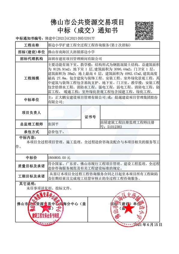 2021年6月15日,經(jīng)評標委員會綜合評審,招標人確認,正大鵬安建設項目管理有限公司中標佛山市南海區(qū)大瀝鎮(zhèn)邵邊小學擴建工程全過程工程咨詢服務項目。