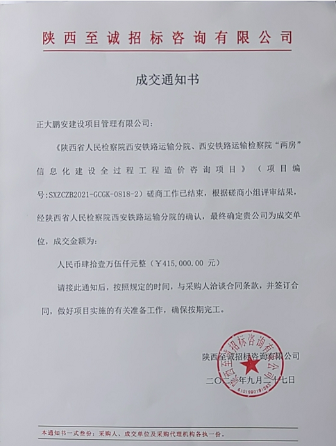 正大鵬安中標(biāo)陜西省人民檢察院西安鐵路運(yùn)輸分院、西安鐵路運(yùn)輸檢察院“兩房”信息化建設(shè)全過程工程造價(jià)咨詢項(xiàng)目