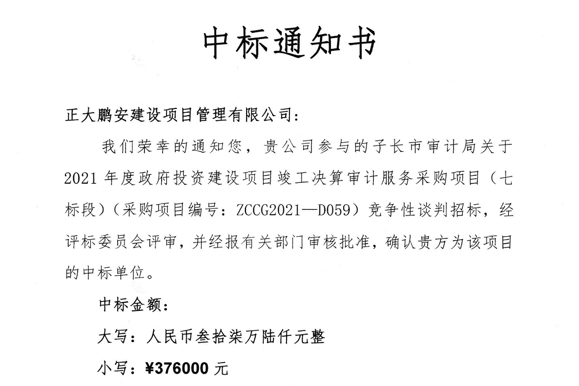 近日,我公司參與了“子長市審計局關(guān)于 2021 年度政府投資建設(shè)項目竣工決算審計服務(wù)采購項目七標(biāo)段”項目投標(biāo),經(jīng)評標(biāo)委員會綜合評審,招標(biāo)人確認(rèn),正大鵬安建設(shè)項目管理有限公司為中標(biāo)人。