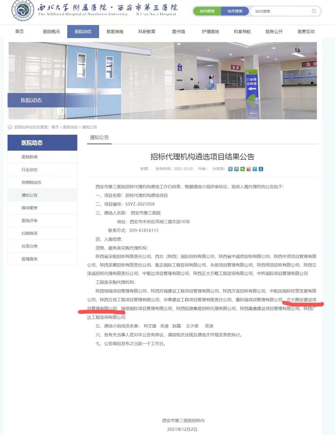 正大鵬安入圍西安市第三醫(yī)院招標(biāo)代理機(jī)構(gòu)遴選項目