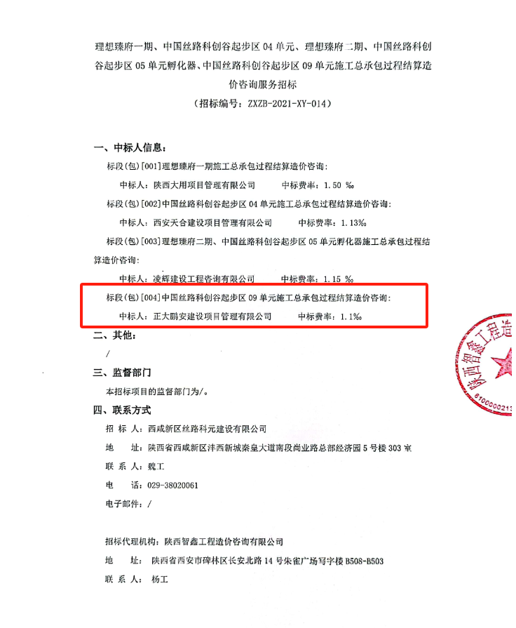 近日,西咸新區(qū)絲路科元建設有限公司對“中國絲路科創(chuàng)谷起步區(qū)09單元施工總承包過程結算造價咨詢服務招標”進行公開招標,經(jīng)評標委員會綜合評審,招標人確認,正大鵬安建設項目管理有限公司為第4包中標人。