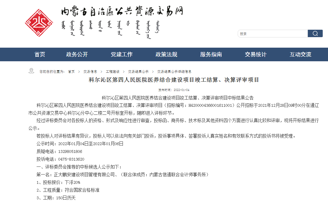 2022年1月,經(jīng)評標(biāo)委員會(huì)評定,招標(biāo)人確認(rèn),正大鵬安建設(shè)項(xiàng)目管理有限公司中標(biāo)科爾沁區(qū)第四人民醫(yī)院醫(yī)養(yǎng)結(jié)合建設(shè)項(xiàng)目竣工結(jié)算、決算評審項(xiàng)目。