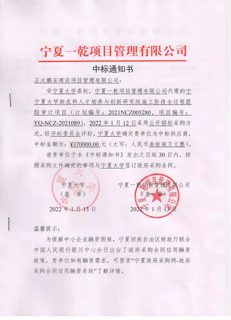 近日,我公司參與了“寧夏大學(xué)新農(nóng)科人才培養(yǎng)與創(chuàng)新研究院施工階段全過(guò)程跟蹤審計(jì)項(xiàng)目”項(xiàng)目的投標(biāo),經(jīng)評(píng)標(biāo)委員會(huì)綜合評(píng)審,招標(biāo)人確認(rèn),正大鵬安建設(shè)項(xiàng)目管理有限公司被確認(rèn)為中標(biāo)供應(yīng)商。