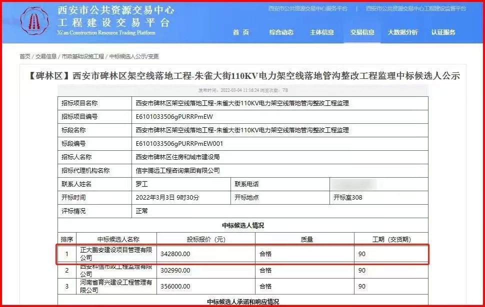 2022年3月,經(jīng)評標委員會評定,招標人確認,正大鵬安建設項目管理有限公司中標西安市碑林區(qū)住房和城鄉(xiāng)建設局的“西安市碑林區(qū)架空線落地工程-朱雀大街110KV電力架空線落地管溝整改工程監(jiān)理”項目。