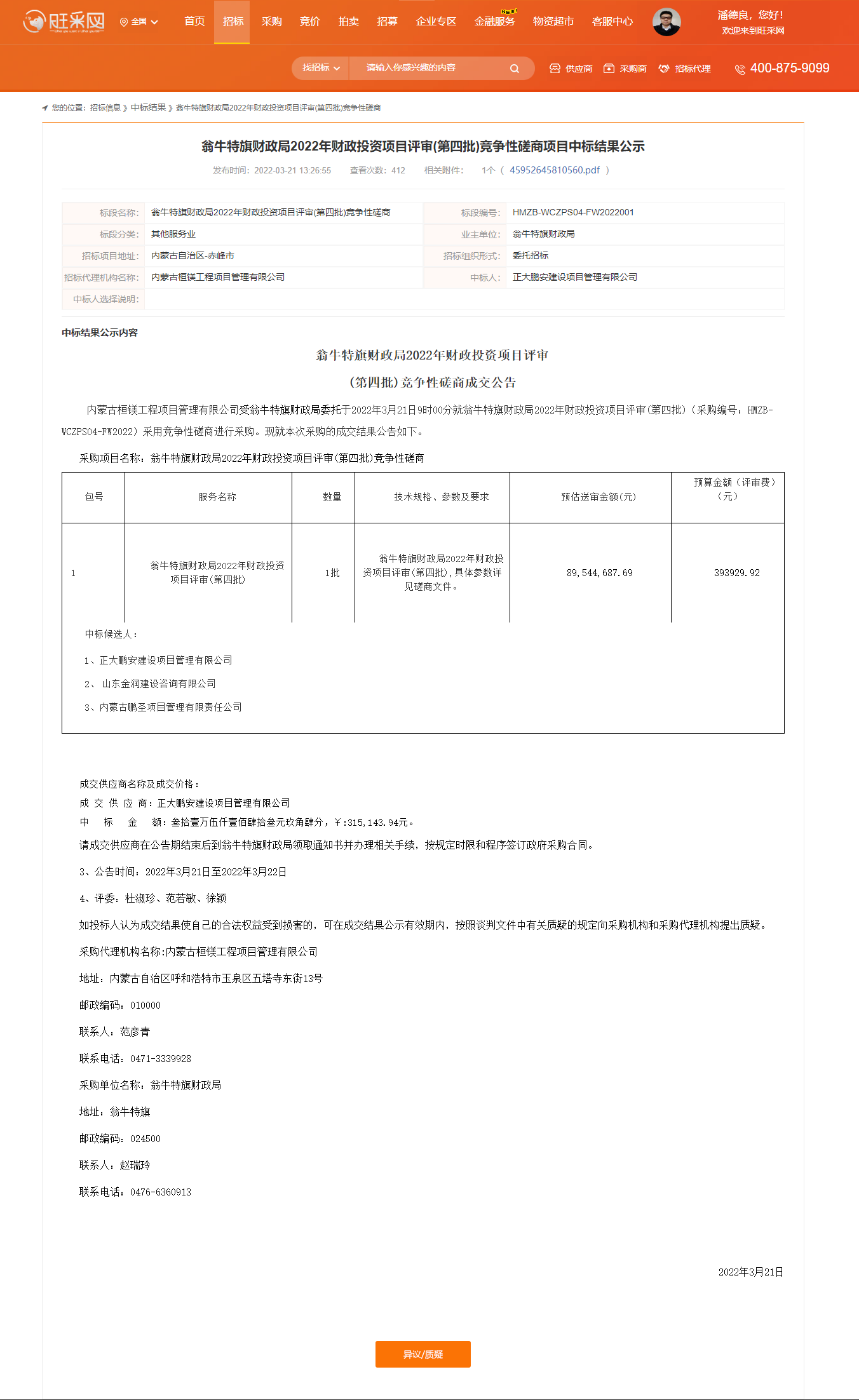 正大鵬安中標(biāo)翁牛特旗財政局2022年財政投資項(xiàng)目評審(第四批)