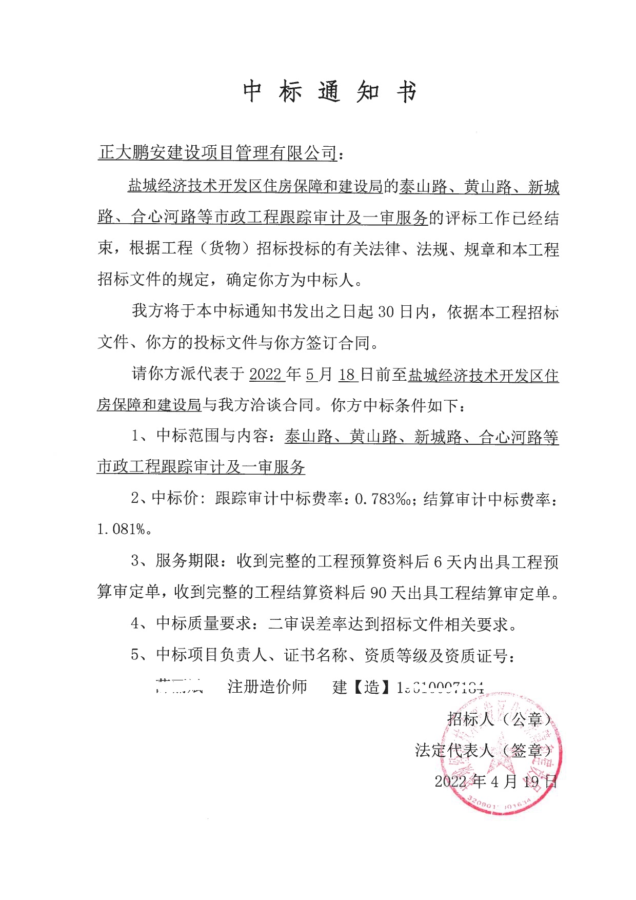 2022年4月,經(jīng)評標委員會評定,招標人確認,正大鵬安建設項目管理有限公司中標“泰山路、黃山路、新城路、合心河路等市政工程跟蹤審計及一審服務項目”。