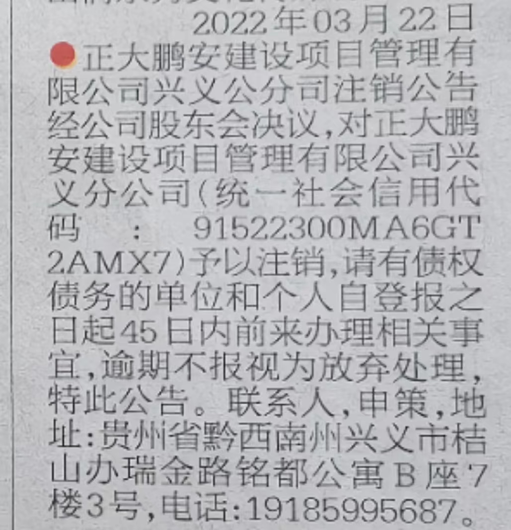 經(jīng)公司股東會決議,對正大鵬安建設(shè)項目管理有限公司興義分公司(統(tǒng)一社會信用代碼:91522300MA6GT2AMX7)予以注銷,請有債權(quán)債務(wù)的單位和個人自登報之日起45日內(nèi)前來辦理相關(guān)事宜,逾期不報視為放棄處理,特此公告。