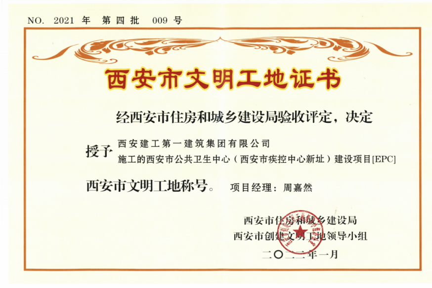 正大鵬安公司監(jiān)理的西安市公共衛(wèi)生中心(西安市疾控中心新址)建設(shè)項(xiàng)目【EPC】監(jiān)理,在西安市2021年第四批文明工地評(píng)選活動(dòng)中,榮獲“西安市文明工地稱(chēng)號(hào)”。