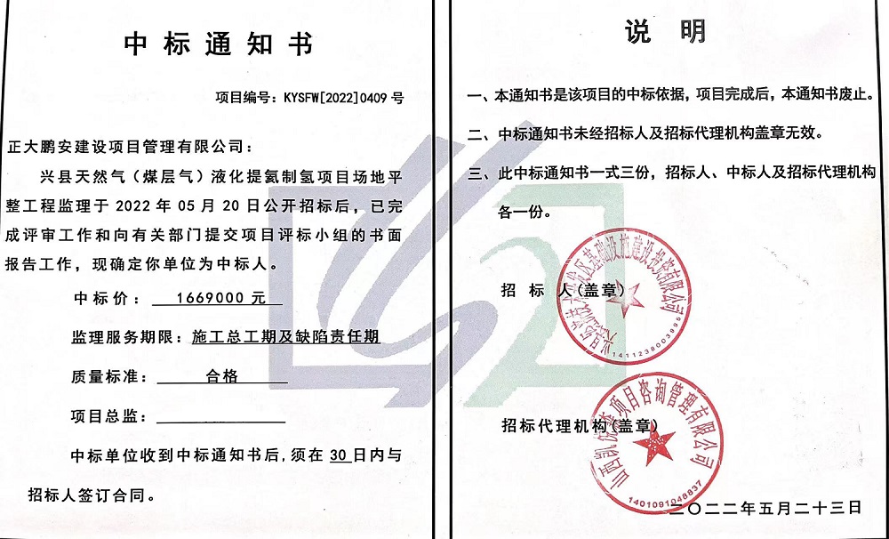 近日,我公司參與”興縣天然氣(煤層氣)液化提氦制氫項目場地平整工程監(jiān)理項目”,經(jīng)評審委員會綜合評審,招標(biāo)人確認(rèn),正大鵬安公司中標(biāo)。
