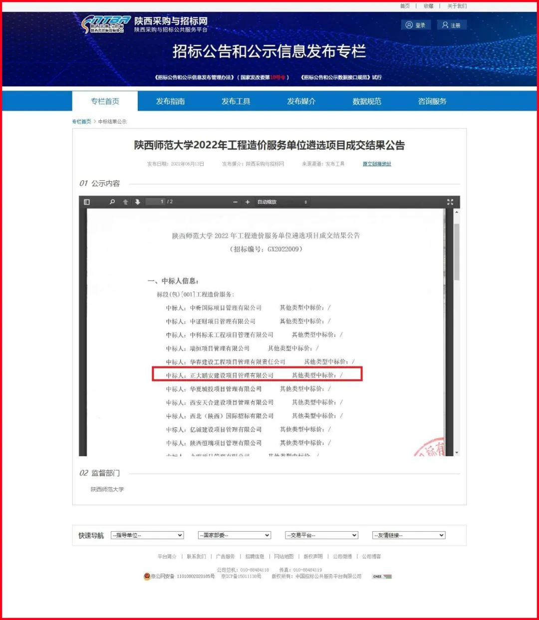 正大鵬安中標(biāo)陜西師范大學(xué)2022年工程造價服務(wù)單位遴選項目