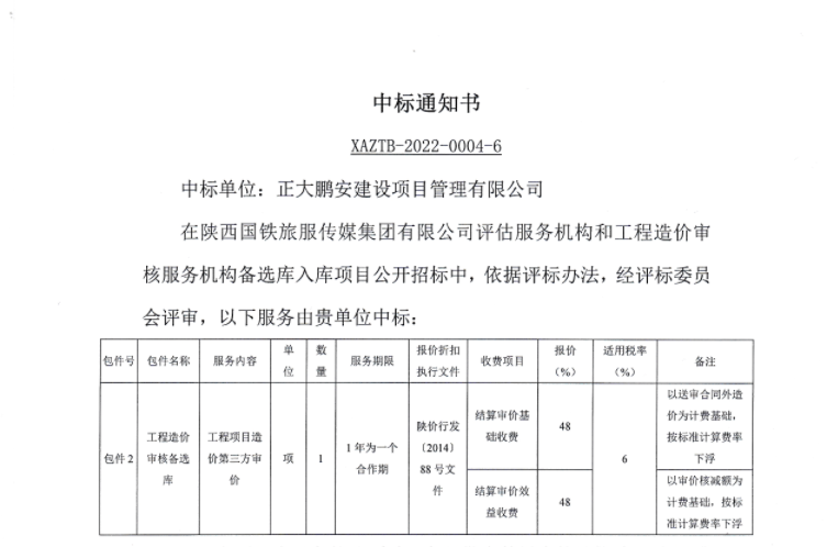 正大鵬安中標(biāo)陜西國(guó)鐵旅服傳媒集團(tuán)有限公司評(píng)估服務(wù)機(jī)構(gòu)和工程造價(jià)審核服務(wù)機(jī)構(gòu)備選庫(kù)入庫(kù)項(xiàng)目