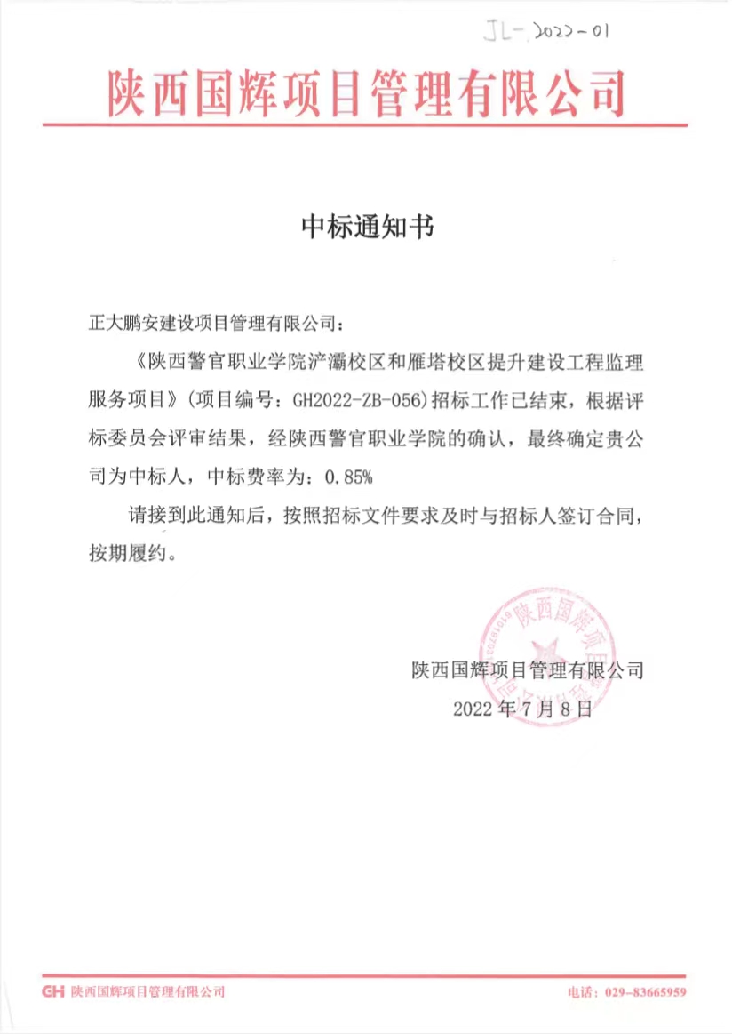 2022年7月,經(jīng)評(píng)標(biāo)委員會(huì)評(píng)定,招標(biāo)人確認(rèn),正大鵬安建設(shè)項(xiàng)目管理有限公司中標(biāo)陜西警官學(xué)院的“陜西警官職業(yè)學(xué)院浐灞校區(qū)和雁塔校區(qū)提升建設(shè)工程監(jiān)理服務(wù)項(xiàng)目”項(xiàng)目。