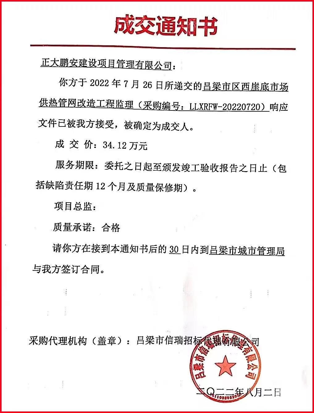 正大鵬安中標(biāo)呂梁市區(qū)西崖底市場供熱管網(wǎng)改造工程監(jiān)理項(xiàng)目