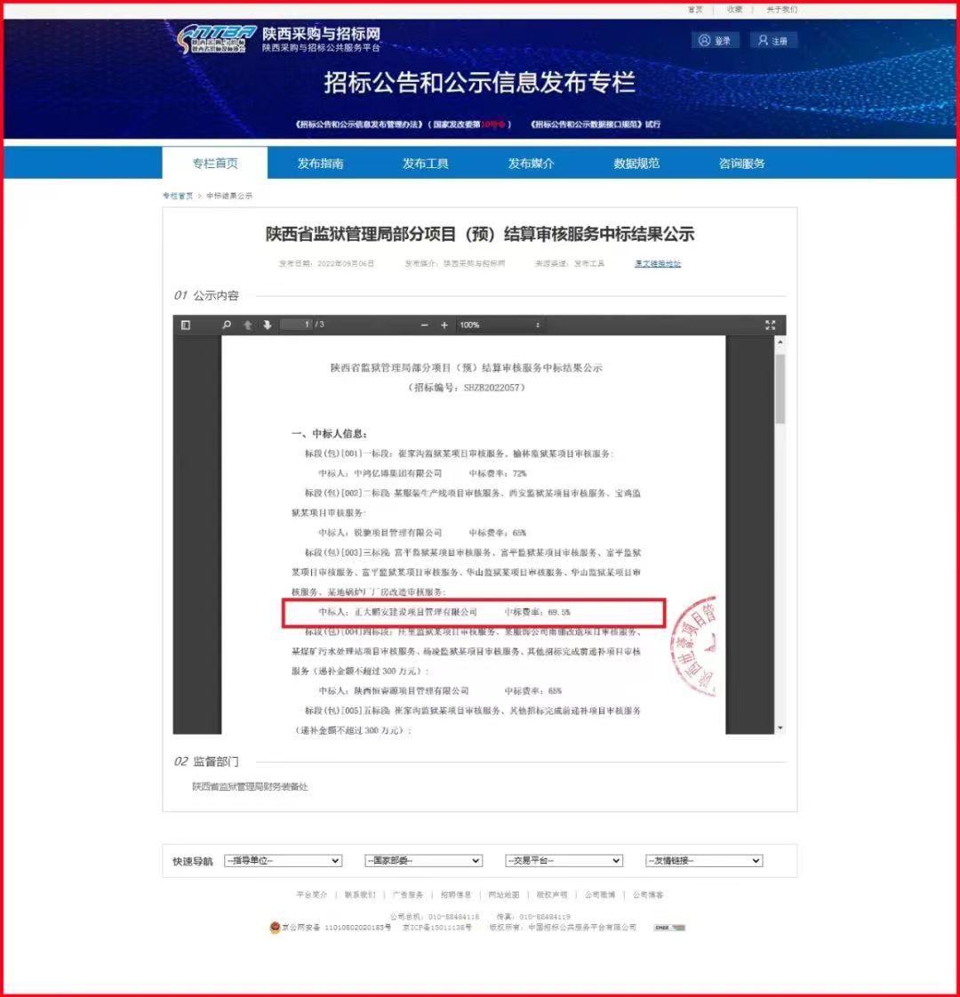 正大鵬安中標(biāo)陜西省監(jiān)獄管理局部分項目(預(yù))結(jié)算審核服務(wù)項目三標(biāo)段