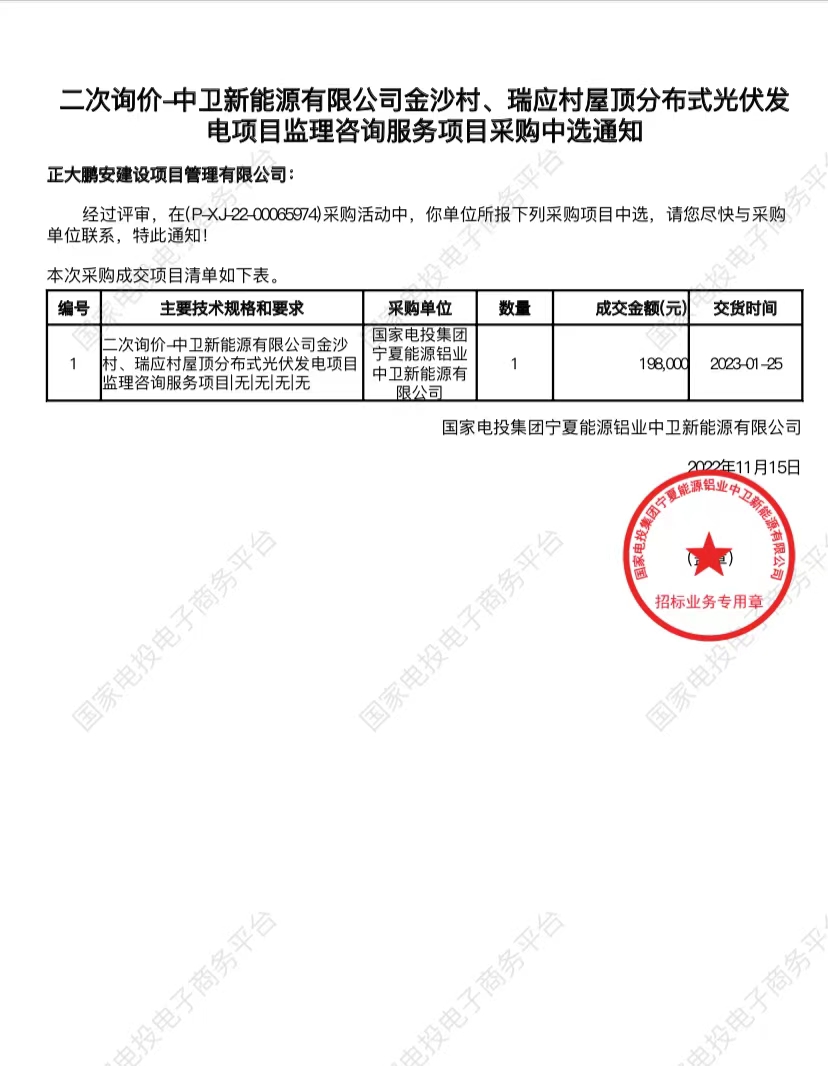 2022年11月,經(jīng)評標委員會評定,招標人確認,正大鵬安建設(shè)項目管理有限公司中標國家電投集團寧夏能源鋁業(yè)中衛(wèi)新能源有限公司的"中衛(wèi)新能源有限公司金沙村、瑞金村屋頂分布式光伏發(fā)電項目監(jiān)理咨詢服務(wù)項目"。