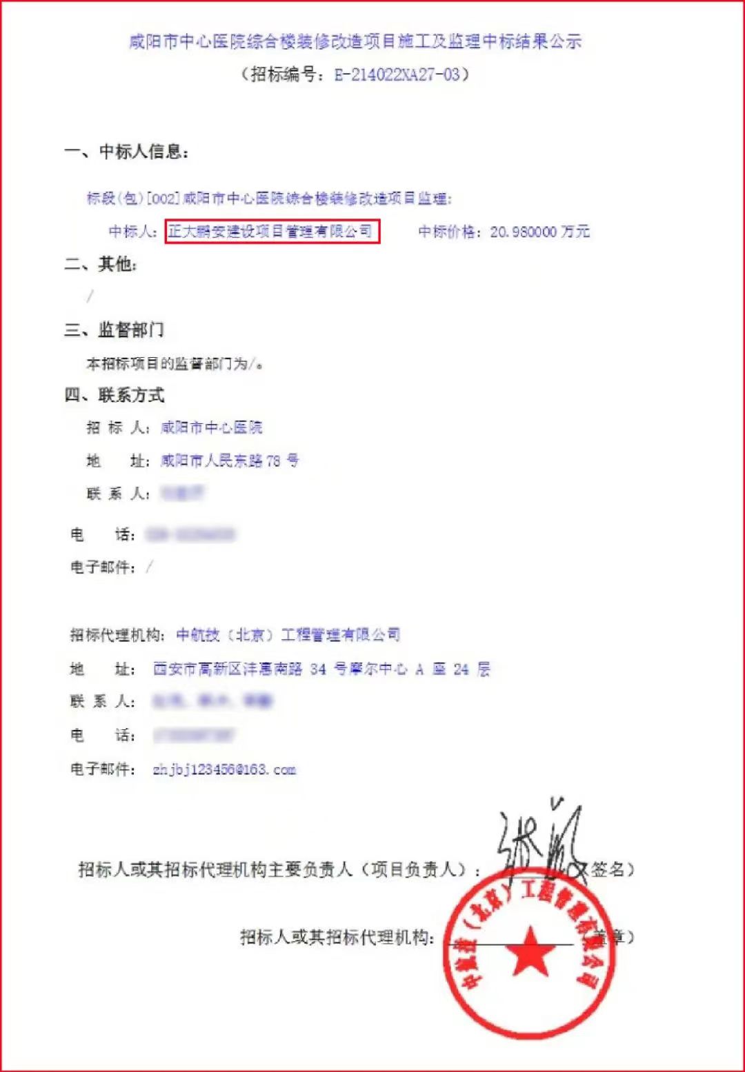 2023年1月,經(jīng)評(píng)標(biāo)委員會(huì)評(píng)定,招標(biāo)人確認(rèn),正大鵬安建設(shè)項(xiàng)目管理有限公司中標(biāo)咸陽(yáng)市中心醫(yī)院的“咸陽(yáng)市中心醫(yī)院綜合樓裝修改造項(xiàng)目監(jiān)理”項(xiàng)目。