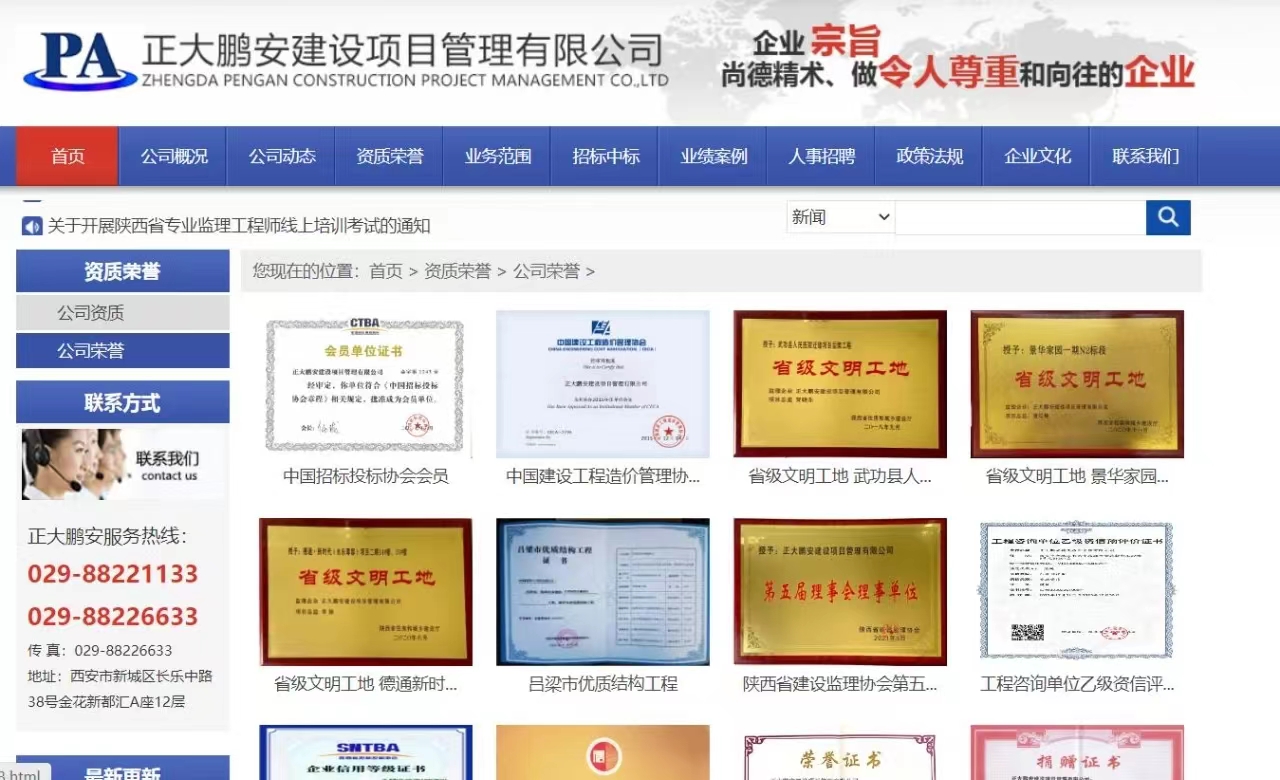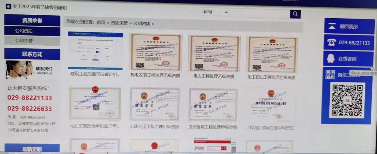 正大鵬安公司擁有市政公用工程監(jiān)理甲級(jí)資質(zhì)、房屋建筑工程監(jiān)理甲級(jí)資質(zhì)、軍工涉密業(yè)務(wù)咨詢服務(wù)資格、化工石油工程監(jiān)理乙級(jí)資質(zhì)、電力工程監(jiān)理乙級(jí)資質(zhì)、機(jī)電安裝工程監(jiān)理乙級(jí)資質(zhì)、人防工程建設(shè)監(jiān)理甲級(jí)資質(zhì)、水利水電工程監(jiān)理丙級(jí)資質(zhì)、地質(zhì)災(zāi)害防治單位監(jiān)理丙級(jí)資質(zhì)、建筑工程質(zhì)量司法鑒定機(jī)構(gòu)資格、工程造價(jià)咨詢(審計(jì))甲級(jí)資質(zhì)、工程招標(biāo)代理機(jī)構(gòu)甲級(jí)資質(zhì)、 政府采購(gòu)招標(biāo)代理甲級(jí)資格、工程咨詢單位乙級(jí)資信、工程造價(jià)司法鑒定機(jī)構(gòu)資格、機(jī)電產(chǎn)品國(guó)際招標(biāo)代理機(jī)構(gòu)資格、中央投資項(xiàng)目招標(biāo)代理機(jī)構(gòu)乙級(jí)資格。