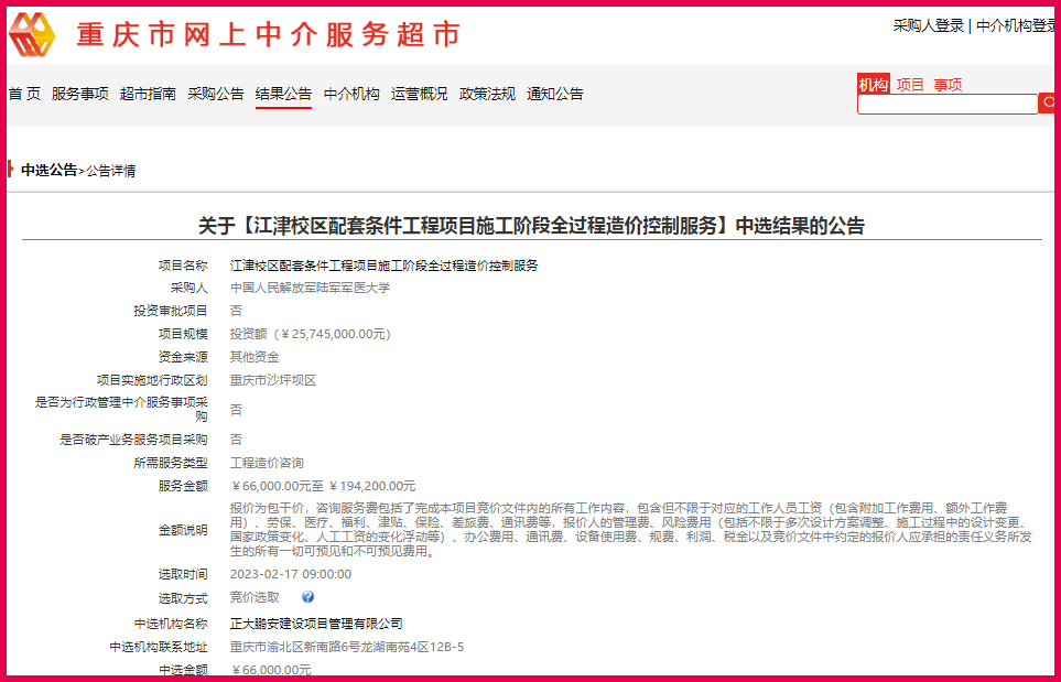2023年2月,經(jīng)評標(biāo)委員會評定,招標(biāo)人確認(rèn),正大鵬安建設(shè)項目管理有限公司中標(biāo)江津校區(qū)配套條件工程項目施工階段全過程造價控制服務(wù)項目。