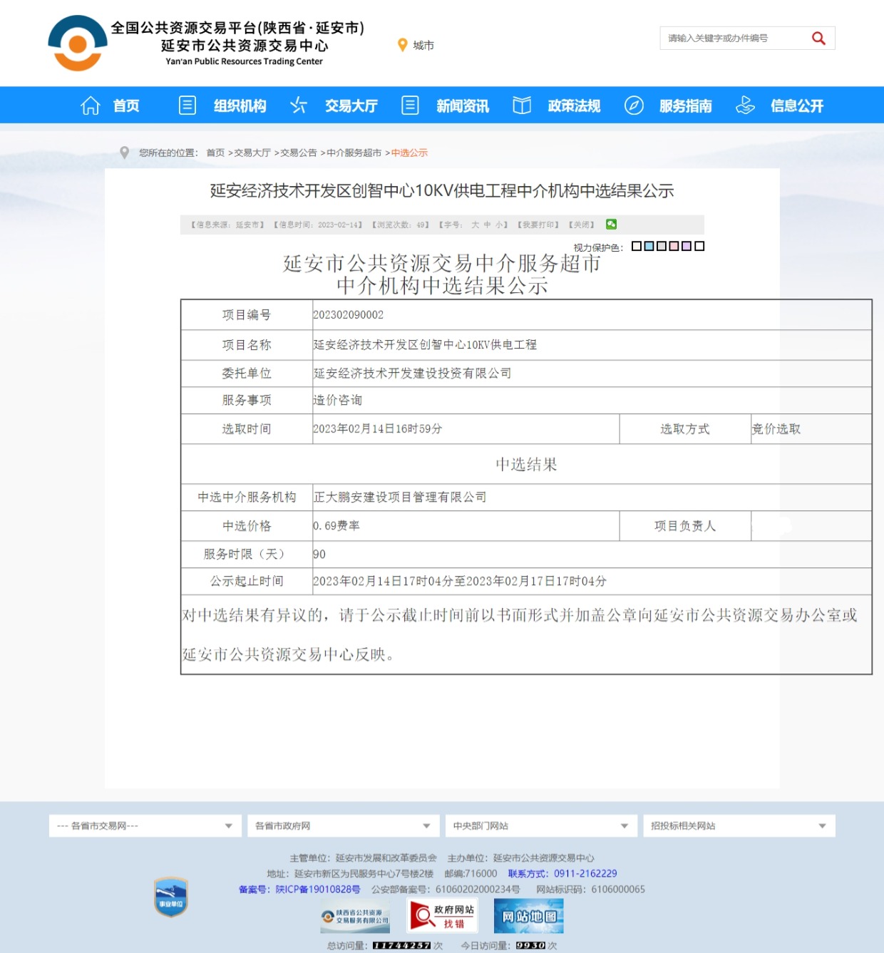2023年2月14日,正大鵬安建設項目管理有限公司在延安市公共資源交易中心中介服務超市機構中選延安經濟技術開發(fā)區(qū)創(chuàng)智中心10KV供電工程。