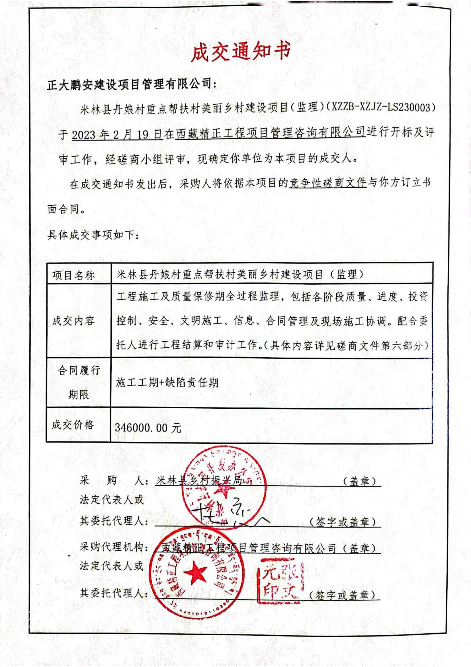 2023年2月21日,經(jīng)評標(biāo)委員會評定,招標(biāo)人確認(rèn),正大鵬安建設(shè)項目管理有限公司中標(biāo)“米林縣丹娘村重點(diǎn)幫扶村美麗鄉(xiāng)村建設(shè)項目 ”。