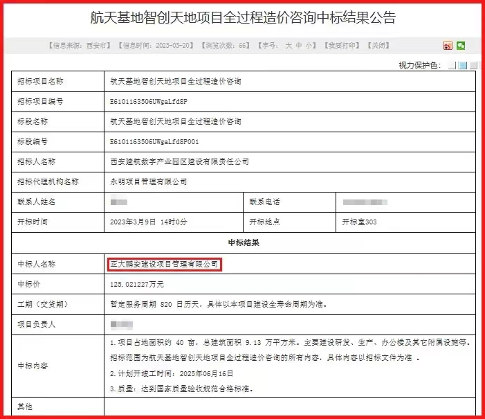 2023年3月,經(jīng)評標(biāo)委員會評定,招標(biāo)人確認(rèn),正大鵬安建設(shè)項目管理有限公司中標(biāo)西安建航數(shù)字產(chǎn)業(yè)園區(qū)建設(shè)有限責(zé)任公司的“航天基地智創(chuàng)天地項目全過程造價咨詢”項目。