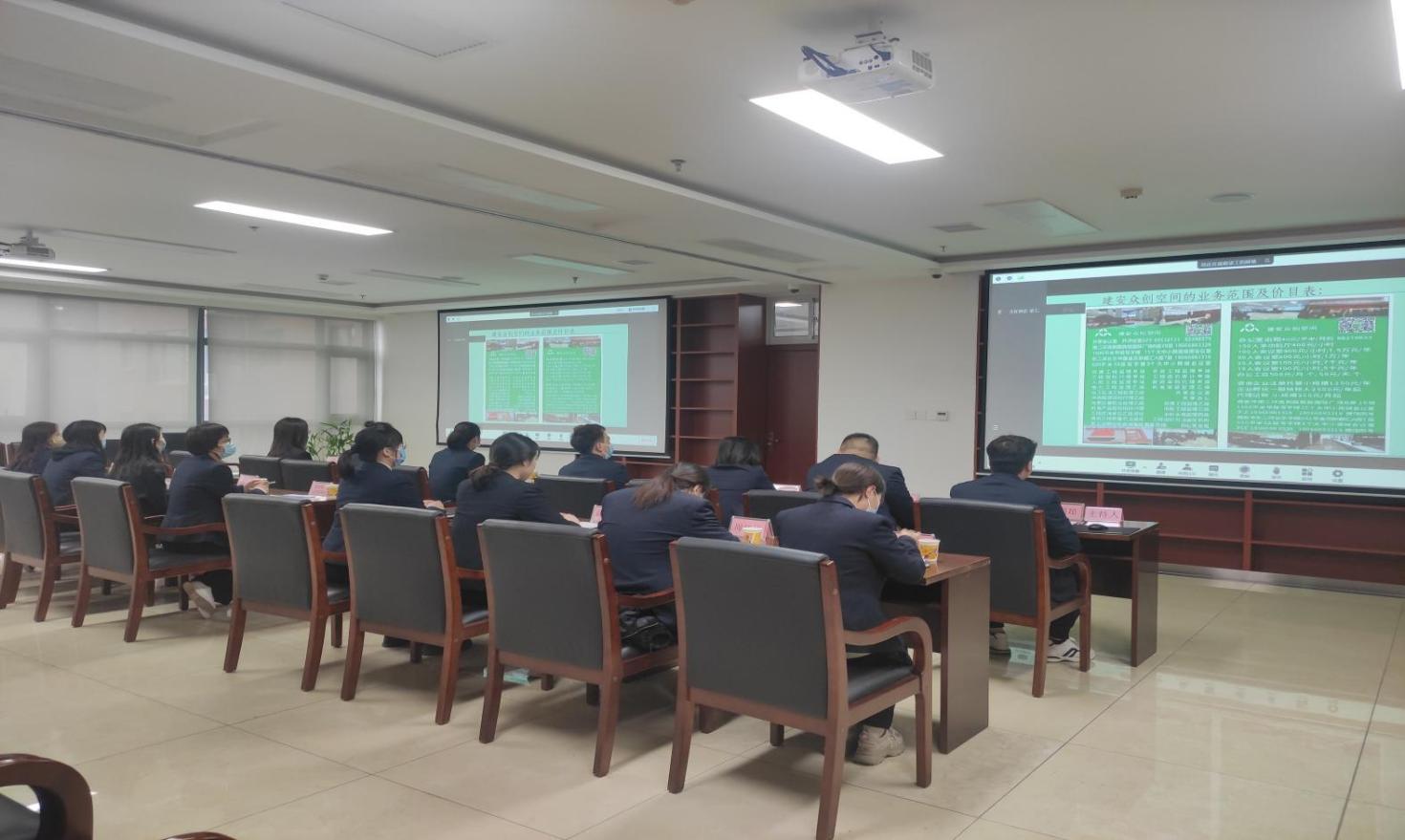 會議第二項:副總工程師劉工進行建安眾創(chuàng)空間推介,在西安市共有2200平米辦公區(qū),東二環(huán)長樂中路金花新都匯7層600平米5A級寫字樓,8個大中小網絡視頻音頻會議室,南二環(huán)高新路西部國際廣場B座28層,1600平米甲級寫字樓,15個大中小網絡視頻音頻會議室,面向社會大眾提供辦公室短租、共享會議室、共享發(fā)標、共享開標評標室、共享工位,會議室出租、辦公室出租;企業(yè)孵化、代理記賬、會務服務等眾創(chuàng)空間服務。