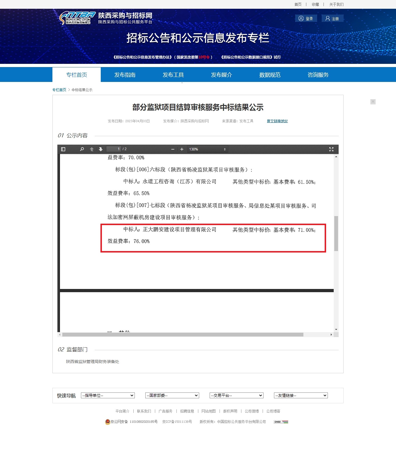 2023年4月,經(jīng)評標(biāo)委員會評定,招標(biāo)人確認(rèn),正大鵬安建設(shè)項目管理有限公司中標(biāo)陜西省監(jiān)獄管理局的“部分監(jiān)獄項目結(jié)算審核服務(wù)七標(biāo)段”項目。