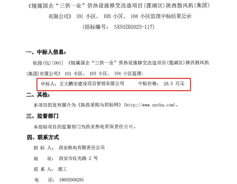 2023年4月,經(jīng)評(píng)標(biāo)委員會(huì)評(píng)定,招標(biāo)人確認(rèn),正大鵬安建設(shè)項(xiàng)目管理有限公司中標(biāo)西安熱電有限責(zé)任公司的“《轄屬國(guó)企“三供一業(yè)”供熱設(shè)施移交改造項(xiàng)目(蓮湖區(qū))陜西鼓風(fēng)機(jī)(集團(tuán))有限公司》101小區(qū)、103小區(qū)、104小區(qū)監(jiān)理”項(xiàng)目。