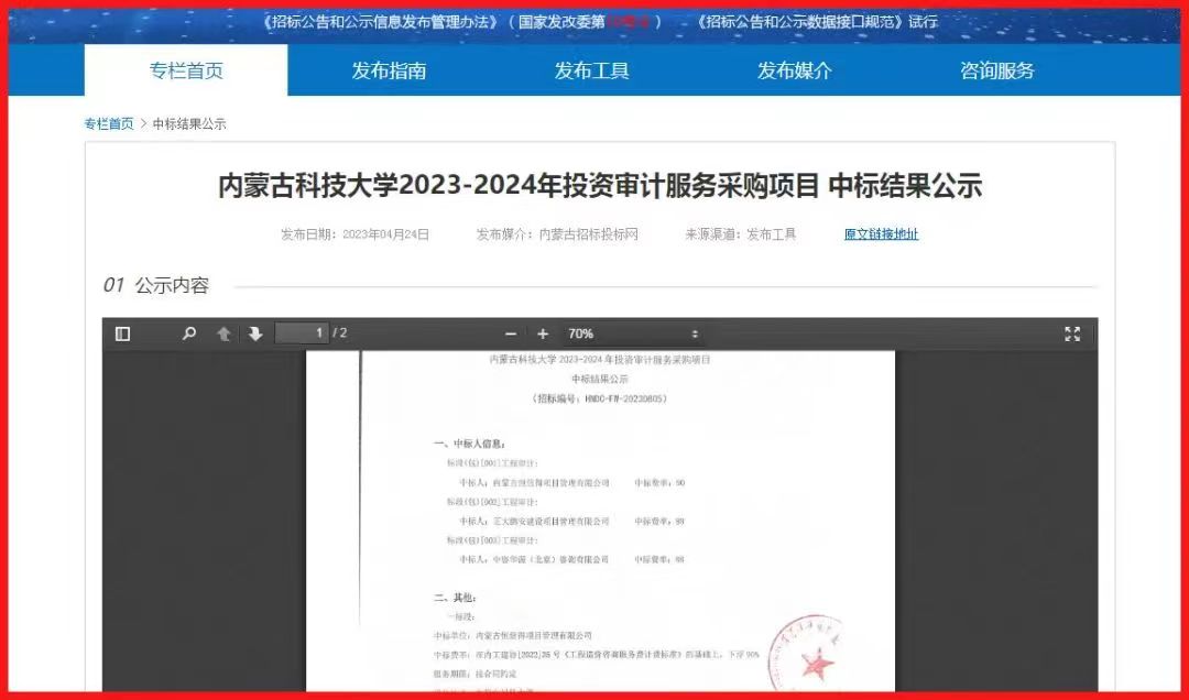 正大鵬安中標(biāo)內(nèi)蒙古科技大學(xué)2023-2024年投資審計(jì)服務(wù)采購項(xiàng)目