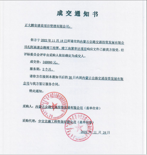 2022年11月,經(jīng)評標(biāo)委員會評定,招標(biāo)人確認(rèn),正大鵬安建設(shè)項目管理有限公司中標(biāo)”內(nèi)蒙古公路交通投資發(fā)展有限公司扎阿高速公路竣工結(jié)算、竣工決算審計”項目。