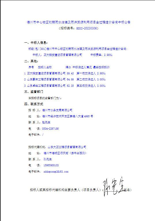 2023年3月,經(jīng)評標(biāo)委員會評定,招標(biāo)人確認(rèn),正大鵬安建設(shè)項目管理有限公司中標(biāo)德州市中心城區(qū)初期雨水治理及雨洪資源利用項目全過程造價咨詢項目。