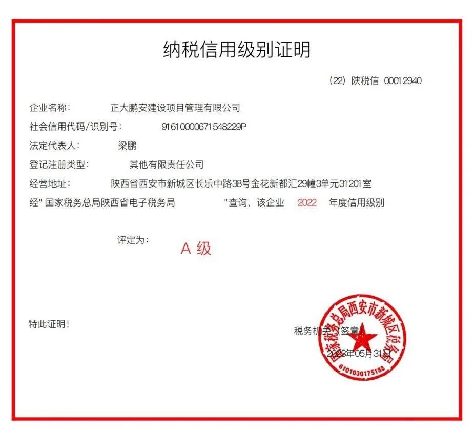 2023年5月31日,經(jīng)“國家稅務(wù)總局陜西省電子稅務(wù)局”查詢,正大鵬安建設(shè)項目管理有限公司“2022年度納稅信用級別”被評定為A級。