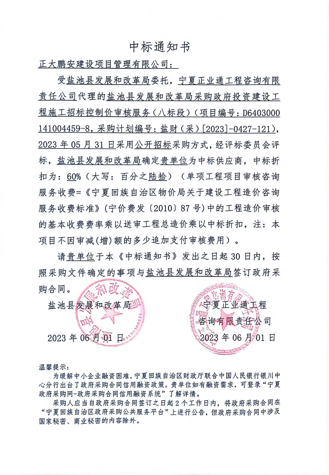 2023年6月1日,經(jīng)評標(biāo)委員會綜合評審,招標(biāo)人確認(rèn),正大鵬安建設(shè)項目管理有限公司中標(biāo)鹽池縣發(fā)展和改革局采購政府投資建設(shè)工程施工招標(biāo)控制價審核服務(wù)項目。