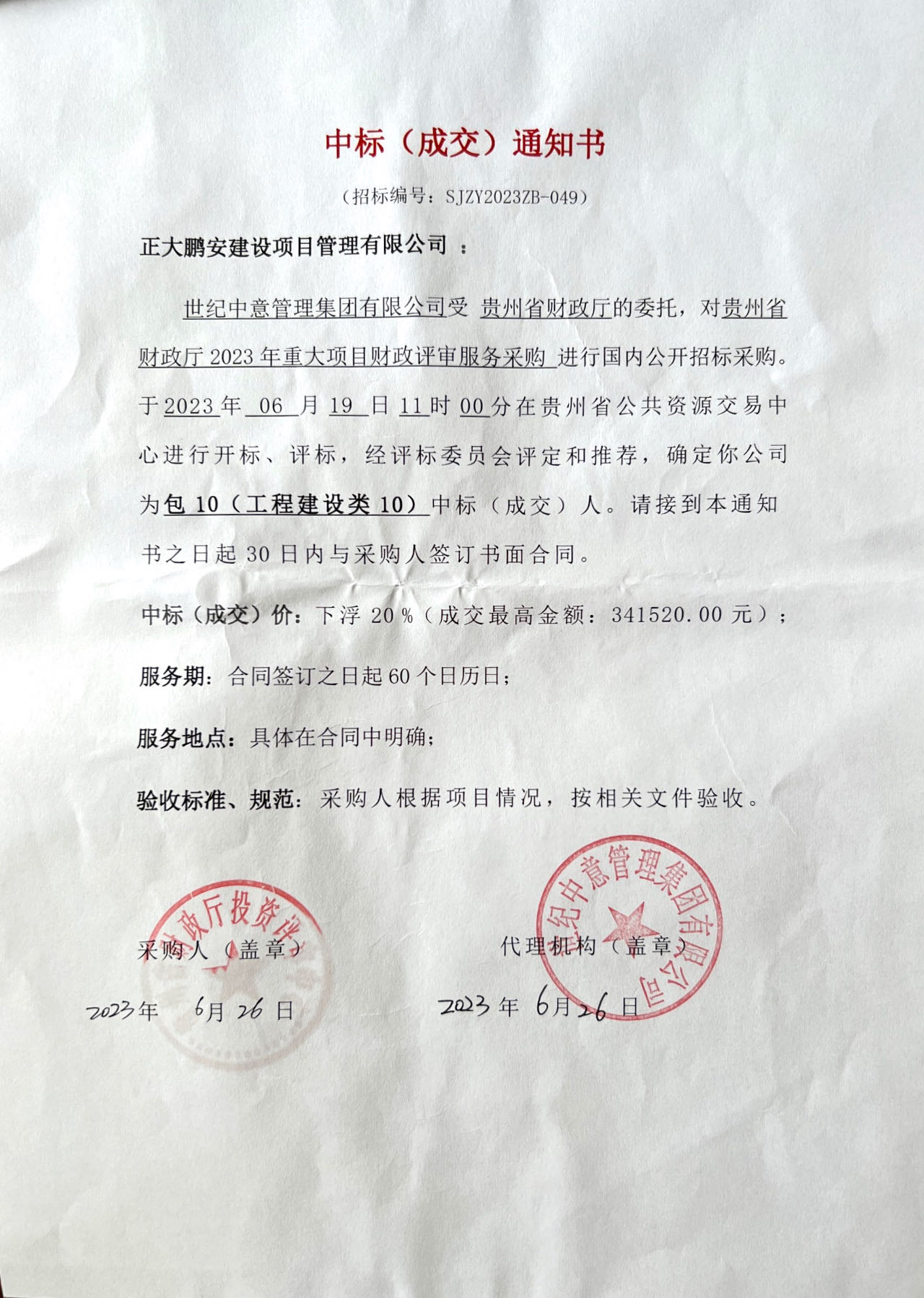 2023年6月,經(jīng)評標(biāo)委員會綜合評審,招標(biāo)人確認,正大鵬安建設(shè)項目管理有限公司中標(biāo)“貴州省財政廳2023年重大項目財政評審服務(wù)采購包10(工程建設(shè)類10)”