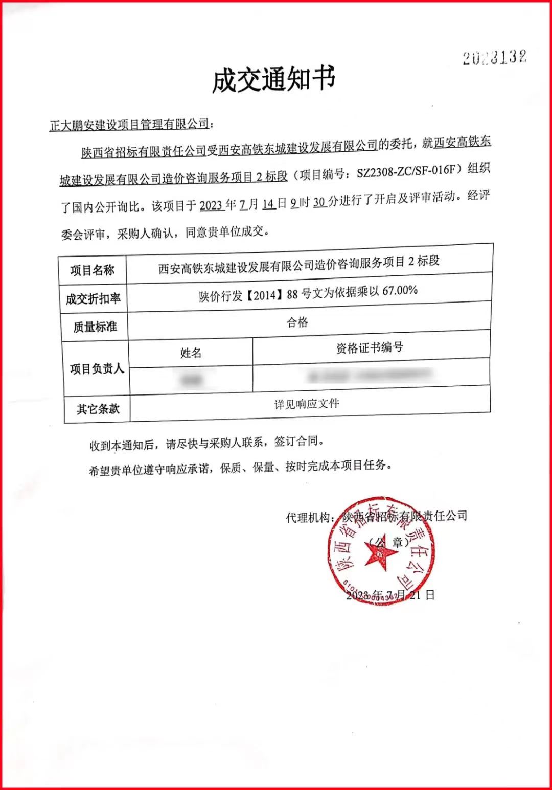 2023年7月,經(jīng)評(píng)標(biāo)委員會(huì)評(píng)定,招標(biāo)人確認(rèn),正大鵬安建設(shè)項(xiàng)目管理有限公司中標(biāo)西安高鐵東城建設(shè)發(fā)展有限公司造價(jià)咨詢服務(wù)項(xiàng)目2標(biāo)段。