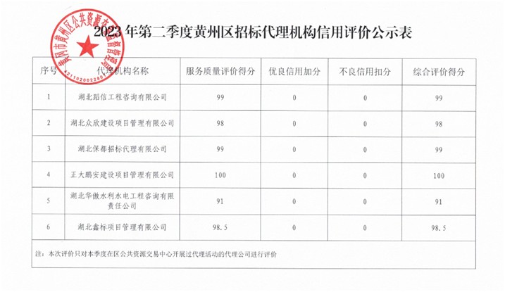 2023年7月,經(jīng)黃岡市黃州區(qū)公共資源交易監(jiān)督管理局評定,正大鵬安建設(shè)項目管理有限公司榮獲2023年第二季度黃州區(qū)招標(biāo)代理機構(gòu)信用評價優(yōu)秀單位。