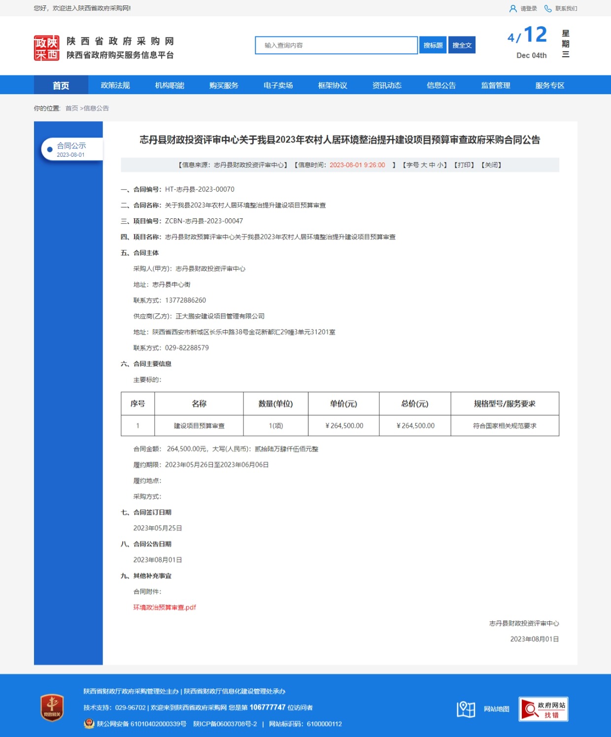 正大鵬安中標(biāo)志丹縣2023年農(nóng)村人居環(huán)境整治提升建設(shè)項(xiàng)目預(yù)算審查政府采購合同