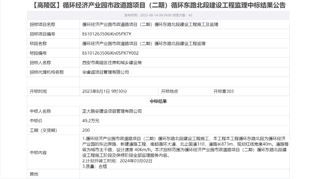 2023年8月,經(jīng)評標(biāo)委員會評定,招標(biāo)人確認(rèn),正大鵬安建設(shè)項目管理有限公司中標(biāo)西安市高陵區(qū)住房和城鄉(xiāng)建設(shè)局的“循環(huán)經(jīng)濟(jì)產(chǎn)業(yè)園市政道路項目(二期)循環(huán)東路北段建設(shè)工程監(jiān)理”項目。