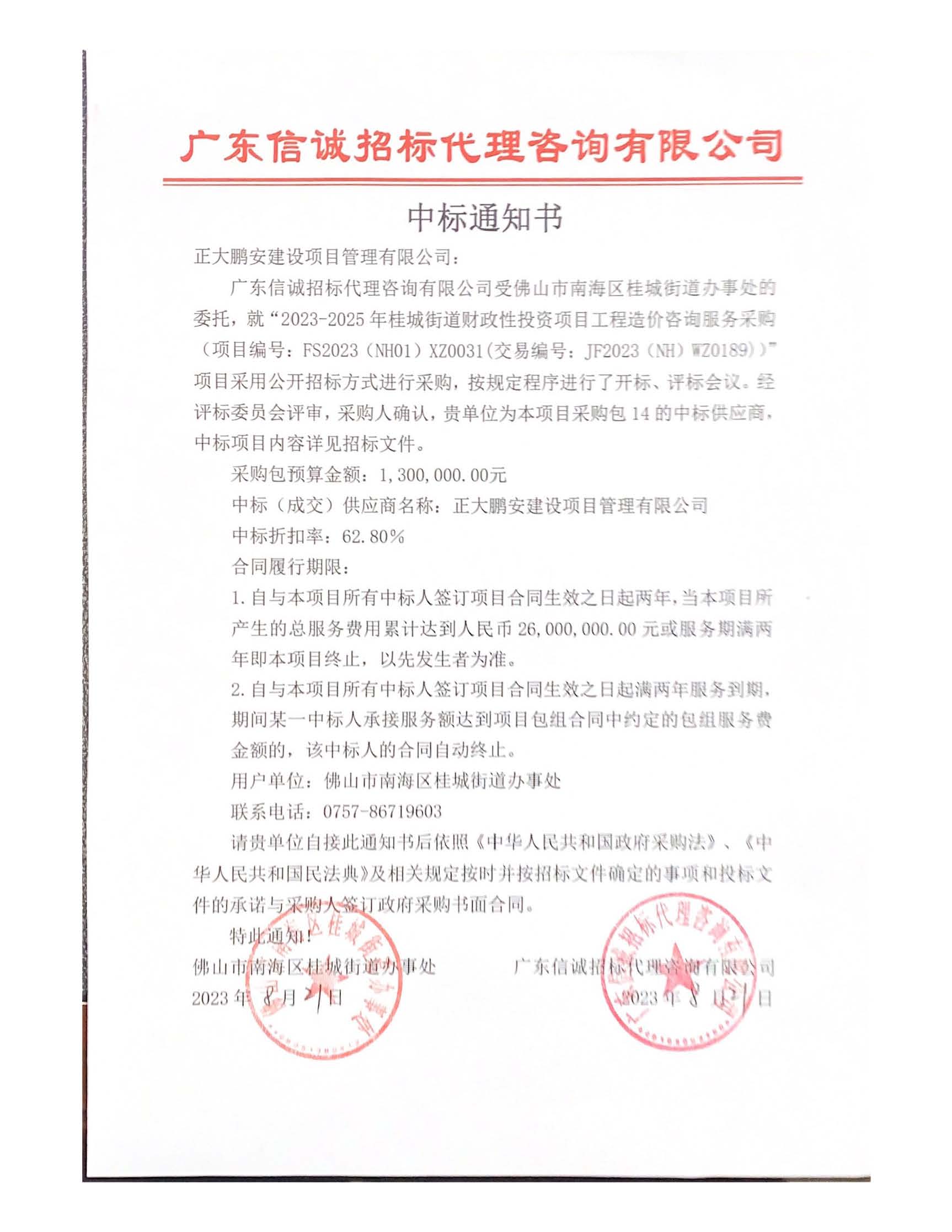 正大鵬安中標(biāo)2023-2025 年桂城街道財(cái)政性投資項(xiàng)目工程造價(jià)咨詢服務(wù)采購項(xiàng)目