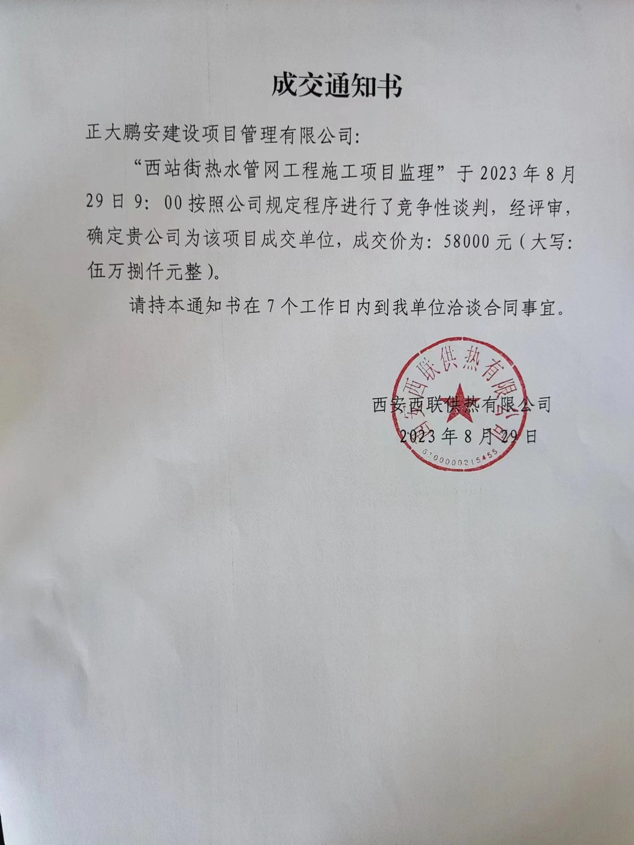 2023年8月,經(jīng)評標委員會評定,招標人確認,正大鵬安建設(shè)項目管理有限公司中標西安西聯(lián)供熱有限公司的“西站街熱水管網(wǎng)工程施工項目監(jiān)理”項目。