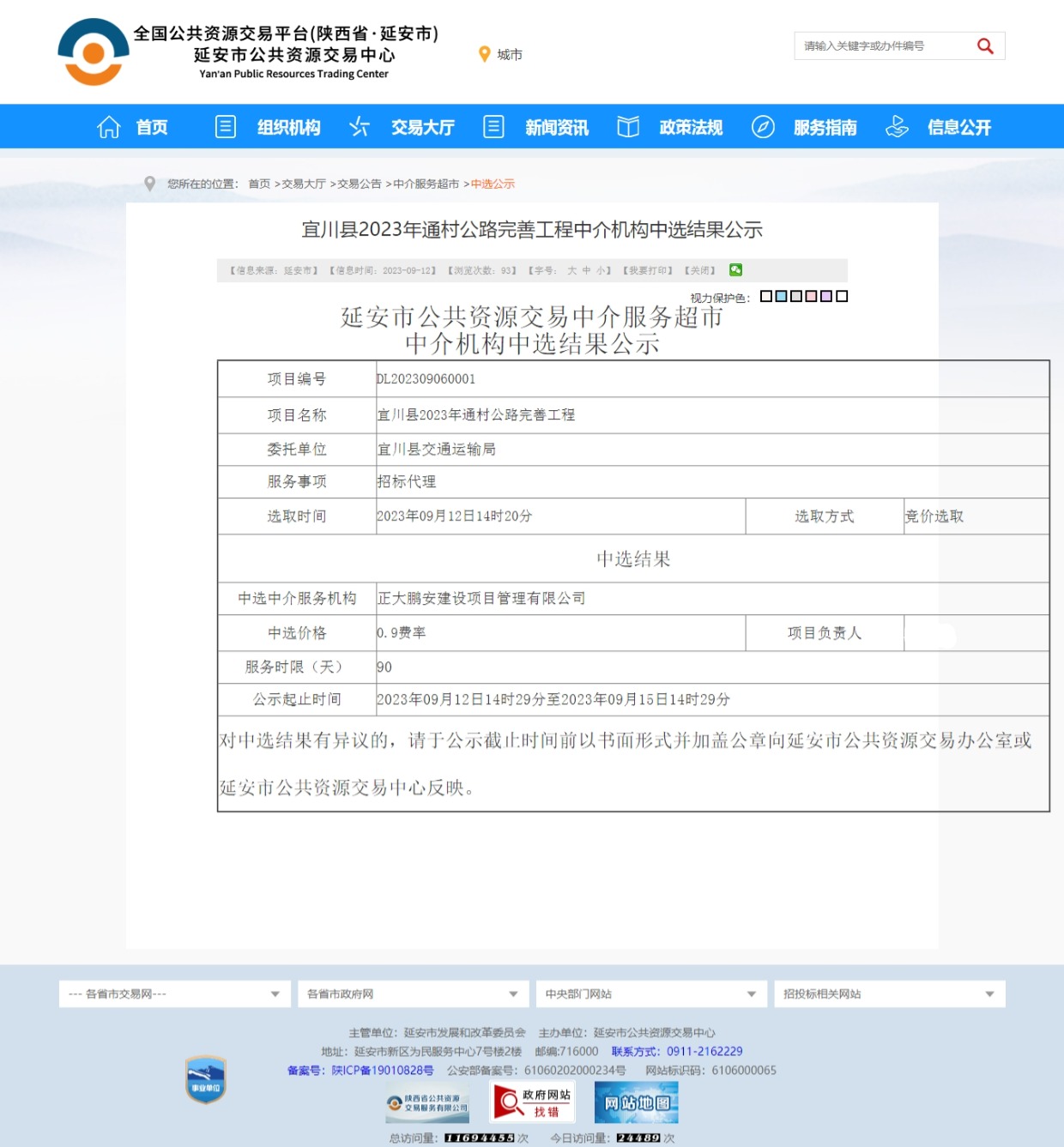 2023年9月12日,正大鵬安建設(shè)項(xiàng)目管理有限公司在延安市公共資源交易中心中介服務(wù)超市機(jī)構(gòu)中選宜川縣2023年通村公路完善工程。